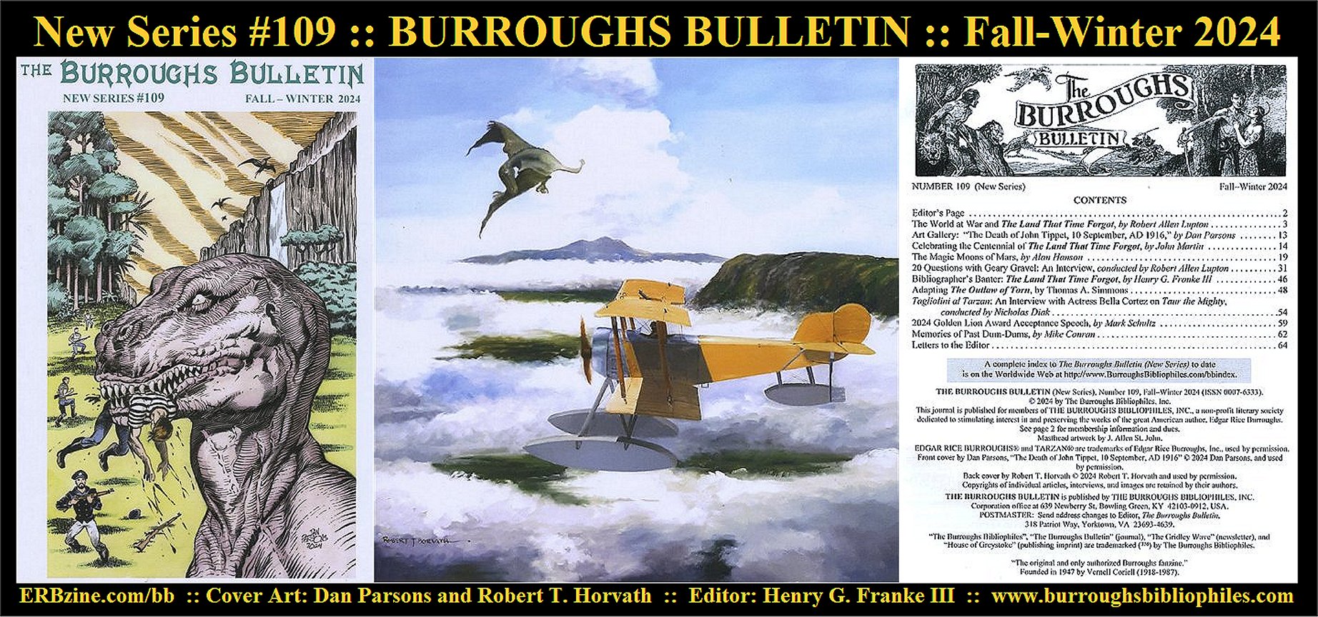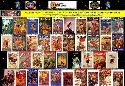 Membership in the Burroughs Bibliophiles is open to anyone interested in the life and writings of Edgar Rice Burroughs. $35 (domestic) and $45 (international). Send checks or money orders to the editor: Henry G. Franke III, 318 Patriot Way, Yorktown, VA 23693-4639 e-mail BurroughsBibliophiles@gmail.com Members are urged to contribute articles, artwork or photos for publication. The Burroughs