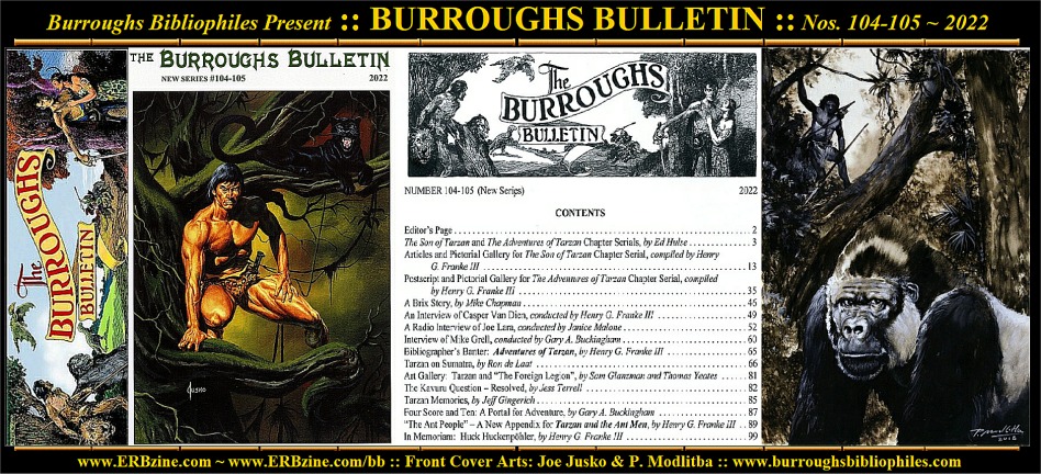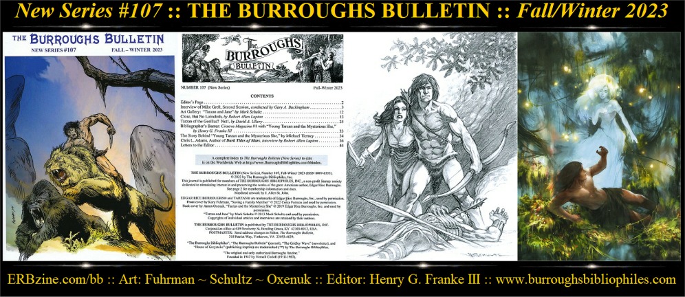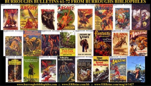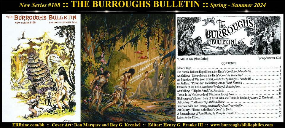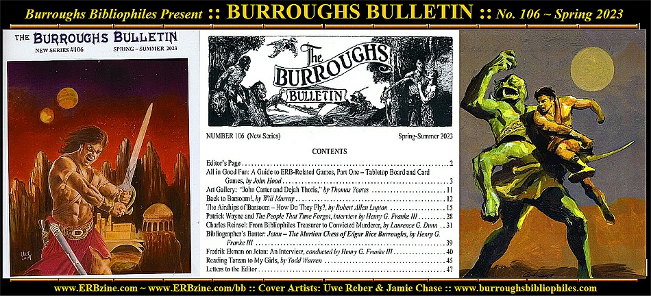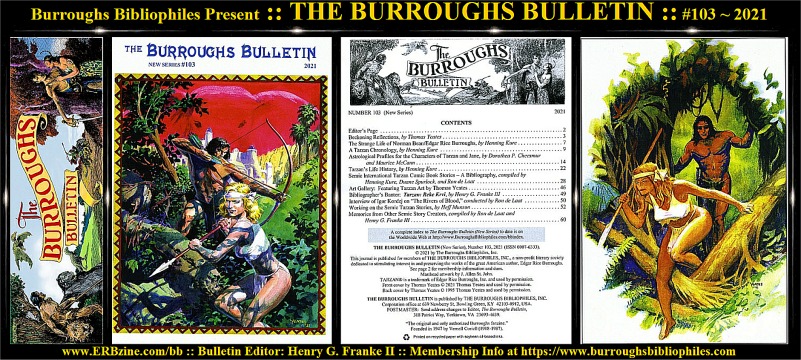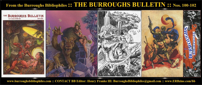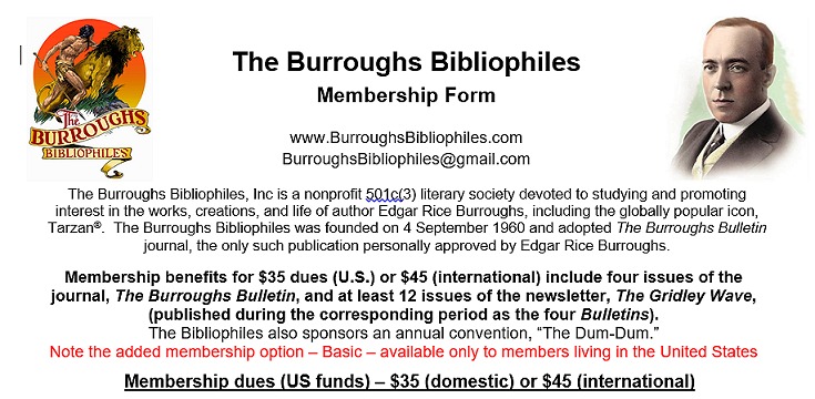 Membership in the Burroughs Bibliophiles is open to anyone interested in the life and writings of Edgar Rice Burroughs. $35 (domestic) and $45 (international). Send checks or money orders to the editor: Henry G. Franke III, 318 Patriot Way, Yorktown, VA 23693-4639 e-mail BurroughsBibliophiles@gmail.com Members are urged to contribute articles, artwork or photos for publication. The Burroughs